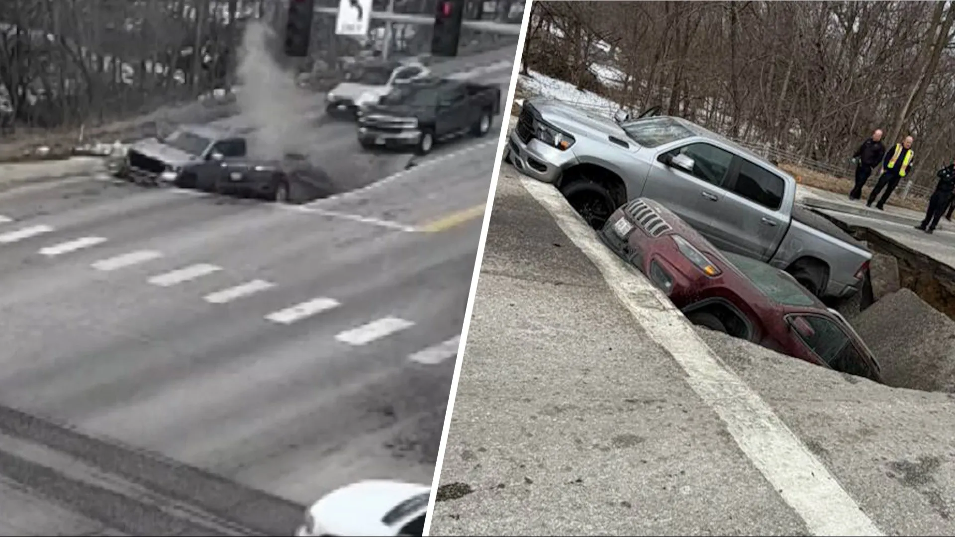 Magari mawili yameponea chupuchupu kuzama kwenye shimo kubwa lililofunguka ghafla kwenye makutano ya barabara katika Jimbo la Nebraska, Marekani, Februari 24.
