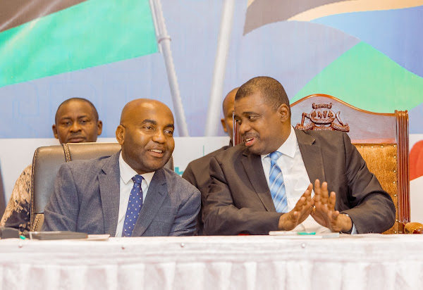 Waziri wa Nchi Ofisi ya Makamu wa Rais Mhe. Mhandisi Hamad Yussuf Masauni(kushoto) akiteta jambo na Makamu wa Pili wa Rais Zanzibar Mhe. Hemed Suleiman Abdulla kabla ya kufungua Semina kwa Wabunge wa Jamhuri ya Muungano wa Tanzania kutoka Zanzibar kuhusu Mfuko wa Jimbo, iliyofanyika Zanzibar, Februari 26, 2026.