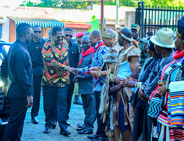 Emmanuel Nchimbi akivalishwa skafu maalum na Chifu wa Kabila la Wangoni (Inkosi