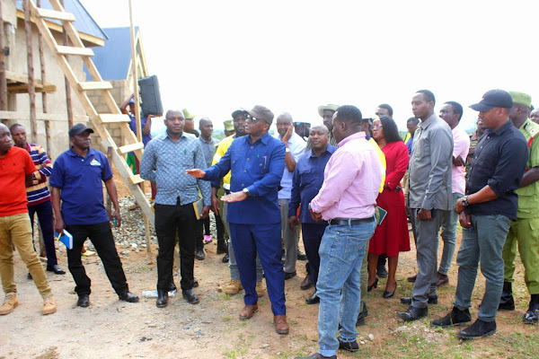 Mkuu wa Mkoa wa Mara,Kanali Evans Mtambi akitembelea moja ya sehemu inapojengwa nyumba ya mwananchi ambaye amepatiwa fidia kupisha upanuzi wa mgodi wa Barrick North Mara,aliongozana na viongozi mbalimbali wa Serikali mkoani humo na maofisa waandamizi wa mgodi.