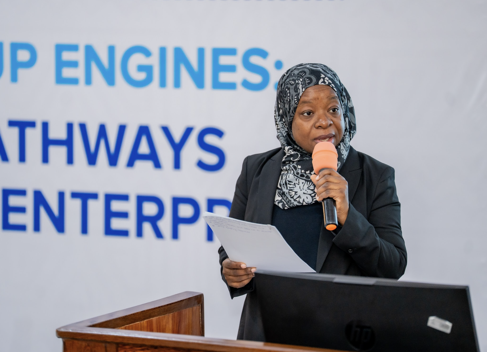 Mhe. Fatma Mabrouk Khamis, Katibu Mkuu, Wizara ya Mawasiliano, Teknolojia ya Habari na Ubunifu, Serikali ya Mapinduzi ya Zanzibar akihutubia wageni waalikwa wakati wa uzinduzi wa semina ya Kubadilishana Wataalamu wa Kitaaluma inayolenga kuvigeuza Vyuo Vikuu kuwa injini za kuanzisha biashara bunifu changa na kukuza ujasiriamali. Semina hiyo inafanyika katika Chuo cha IIT Madras Zanzibar na kuandaliwa na UNDP Tanzania kupitia Mradi wake wa Ubunifu wa FUNGUO, kwa ushirikiano na Serikali ya Mapinduzi ya Zanzibar, ambapo imewakutanisha viongozi wa vyuo vikuu, watunga sera na wadau wa mifumo ya ubunifu kutoka Afrika Mashariki kuanzia Machi 4–6, 2026.