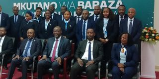 Mwanasheria Mkuu wa Serikali Hamza Johari (wapili kushoto) akiwa kwenye picha ya pamoja na Mwandishi Mkuu wa Sheria, Onorius Njole wa kwanza kushoto. Watatu kushoto ni Mkurugenzi wa Mashtaka DPP Sylvester Mwakitalu. Wengine kwenye picha ni watumishi wa Ofisi ya Mwandishi Mkuu wa Sheria