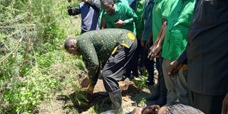 Mwenyekiti wa jumuiya ya wazazi ya CCM, Fadhili Maganya, akipanda miti katika eneo la ekari 6.5 lililoko kata ya Migungani, Wilaya ya Arumeru lililotengwa kwa ajili ya ujenzi wa chuo cha VETA kusaidia vijana walioathirika na madawa ya kulevya. Picha na Bertha Ismail