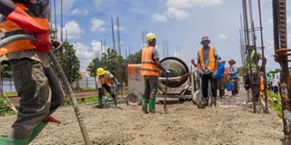 Mafundi wakiendelea na kazi kwenye ujenzi wa Soko kuu la Wilaya ya Bariadi.