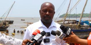 Kaimu Afisa Mfawidhi wa Shirika la Utawala wa Meli Tanzania TASAC Mhandisi, Christopher Mlelwa akizungumza na waandishi wa habari katika Bandari ya Pangani mkoani Tanga jitihada zinazoendelea za kuwatafuta watu watatu wa ajali ya jahazi Nungwi ambao hawajulikani waliopo.