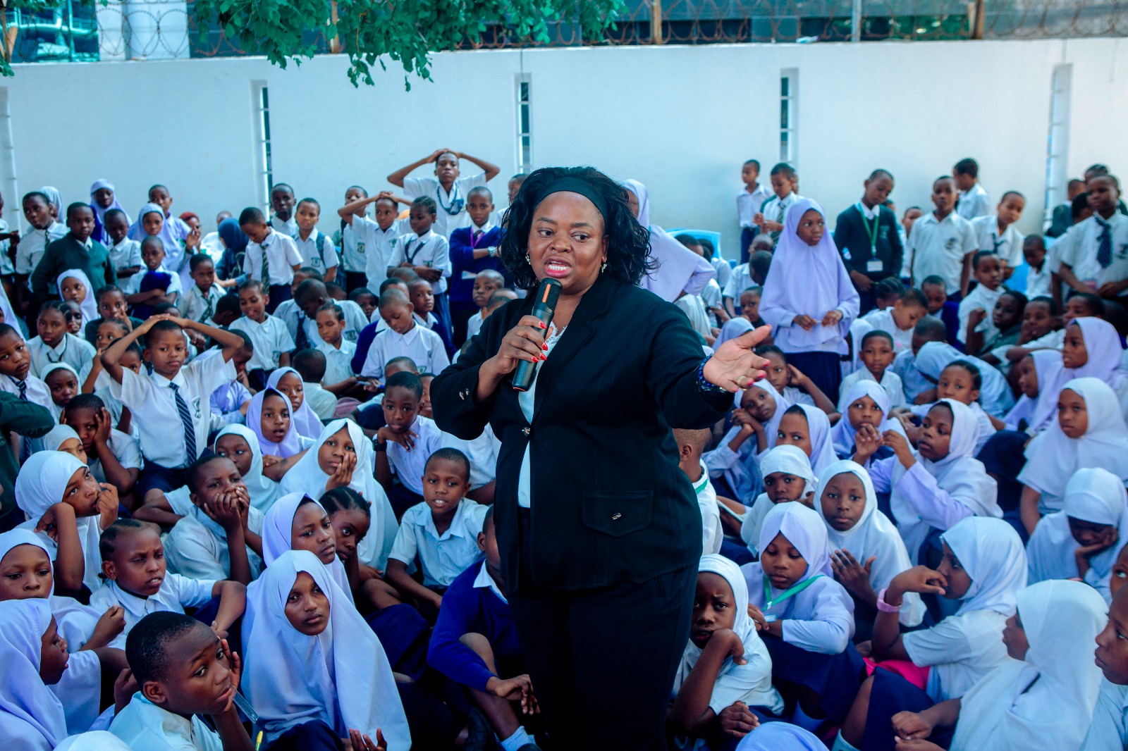 Afisa Mlinda Mlaji kutoka FCC ,Thecla Kitosi,akitoa elimu kuhusiana madhara ya bidhaa bandia katika shule ya Msingi Bunge ikiwa ni sehemu ya kuelekea Maadhimisho ya Wiki ya Siku ya Haki za Mlaji Duniani.