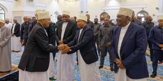 Rais wa Zanzibar, Dk Hussein Mwinyi akisalimiana na aliyekuwa Makamu wa Kwanza wa Rais katika kipindi cha awamu ya kwanza ya utawala wake, Othaman Masoud katika msikiti wa Zinjibar iliposwaliwa sala ya kitaifa ya Eid Unguja Zanzibar