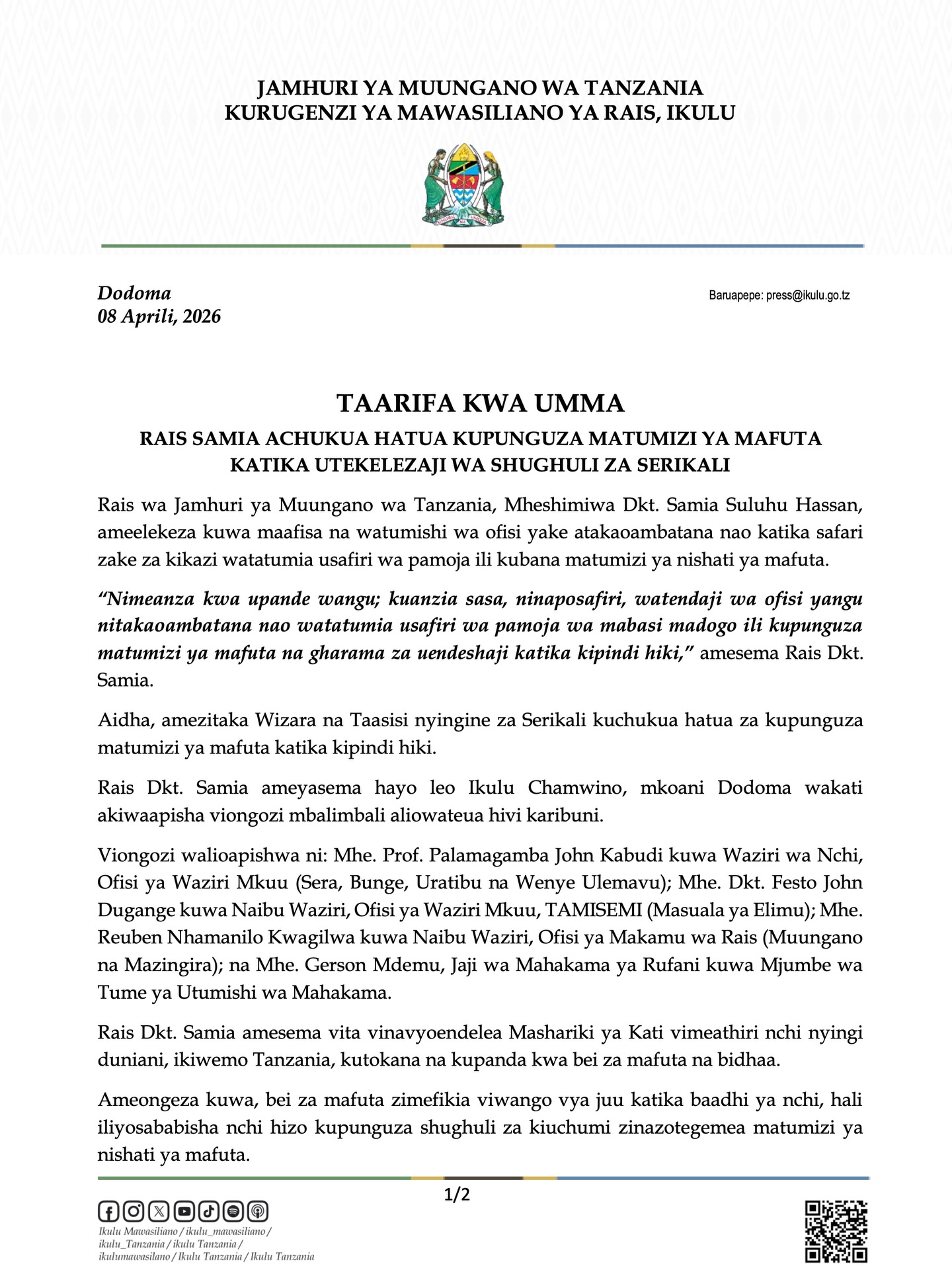 Akizungumza leo Jumatano, Aprili 8, 2026, Ikulu ya Chamwino jijini Dodoma wakati wa kuwaapisha viongozi wapya aliowateua, Rais Samia amesema:
