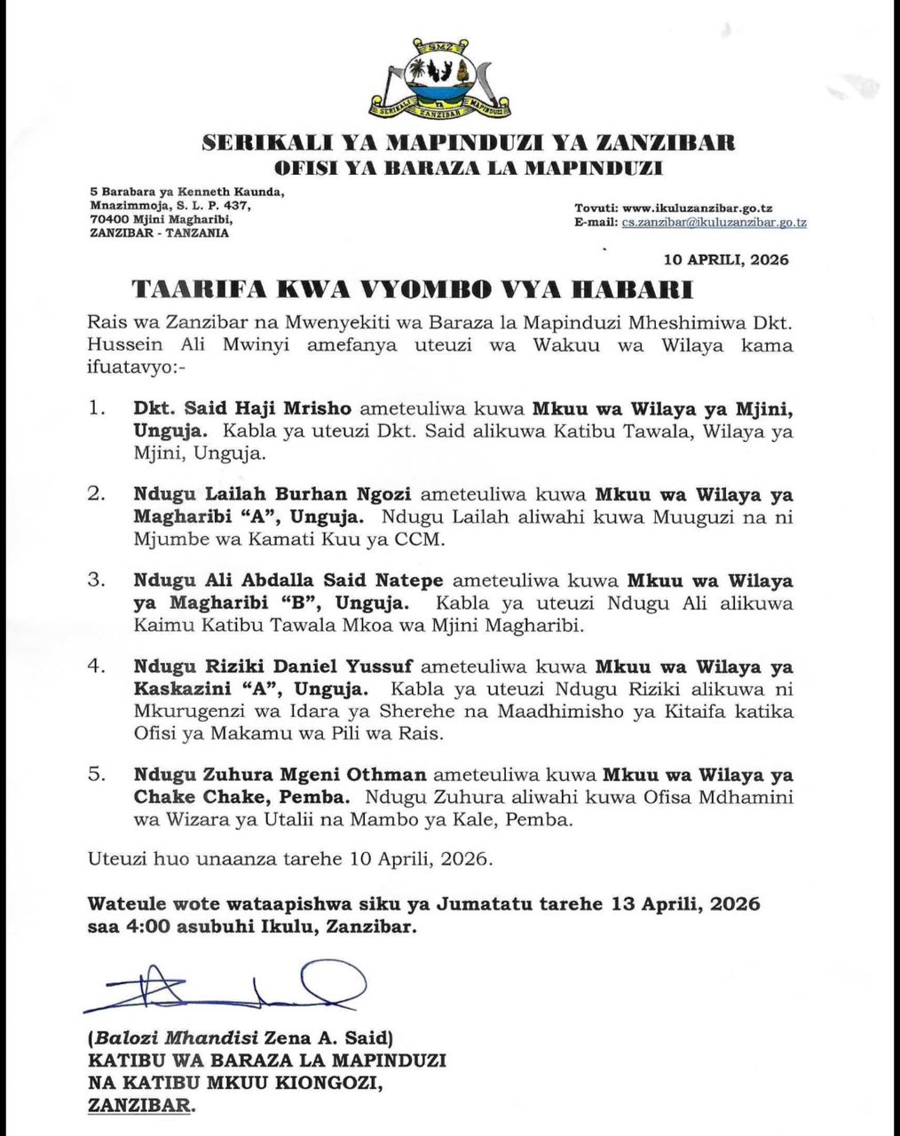 HabariTAARIFA YA UTEUZI KUTOKA ZANZIBAR. Admin5 hours ago01 mins 2 Post navigation Previous: Kyombo asaini mmoja Zambia | MwanaspotiNext: SERIKALI YAENDELEA KUJENGA BARABARA ZA USALAMA MIPAKANI KUIMARISHA ULINZI