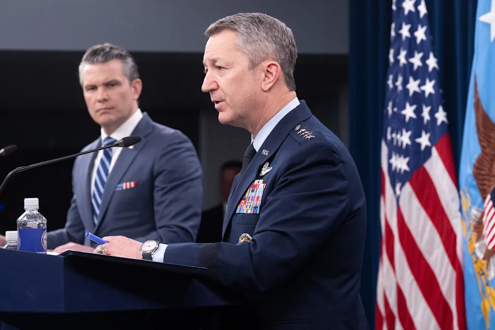 Mkuu wa Majeshi wa Marekani Dan Caine (kulia) akiongea jambo akiwa na Waziri wa Ulinzi wa Marekani Pete Hegseth (kushoto).