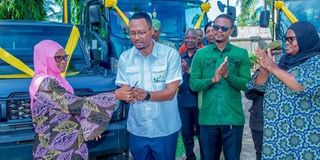 Mkuu wa Mkoa wa Lindi Zainab Telack (kushoto) akimkabidhi funguo za gari Meneja wa Tanesco Mkoa wa Lindi Theodory Hall (watatu kutoka kulia ), ishara ya kupokea vitendea kazi hivyo.Picha na Bahati Mwatesa.