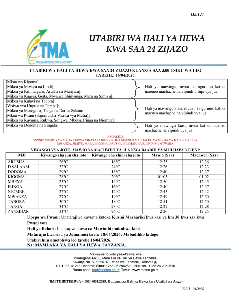 HabariTMA YATABIRI MIKOA TISA KUPATA MVUA KUBWA KESHO. Admin4 days ago01 mins 1 Post navigation Previous: TPBRC yatangaza hatua mpya udhibiti ngumi za kulipwaNext: MNEC-SUKI RABIA HAMIDI,KANSELA WA CPC WAFANYA KIKAO KAZI JIJINI DAR