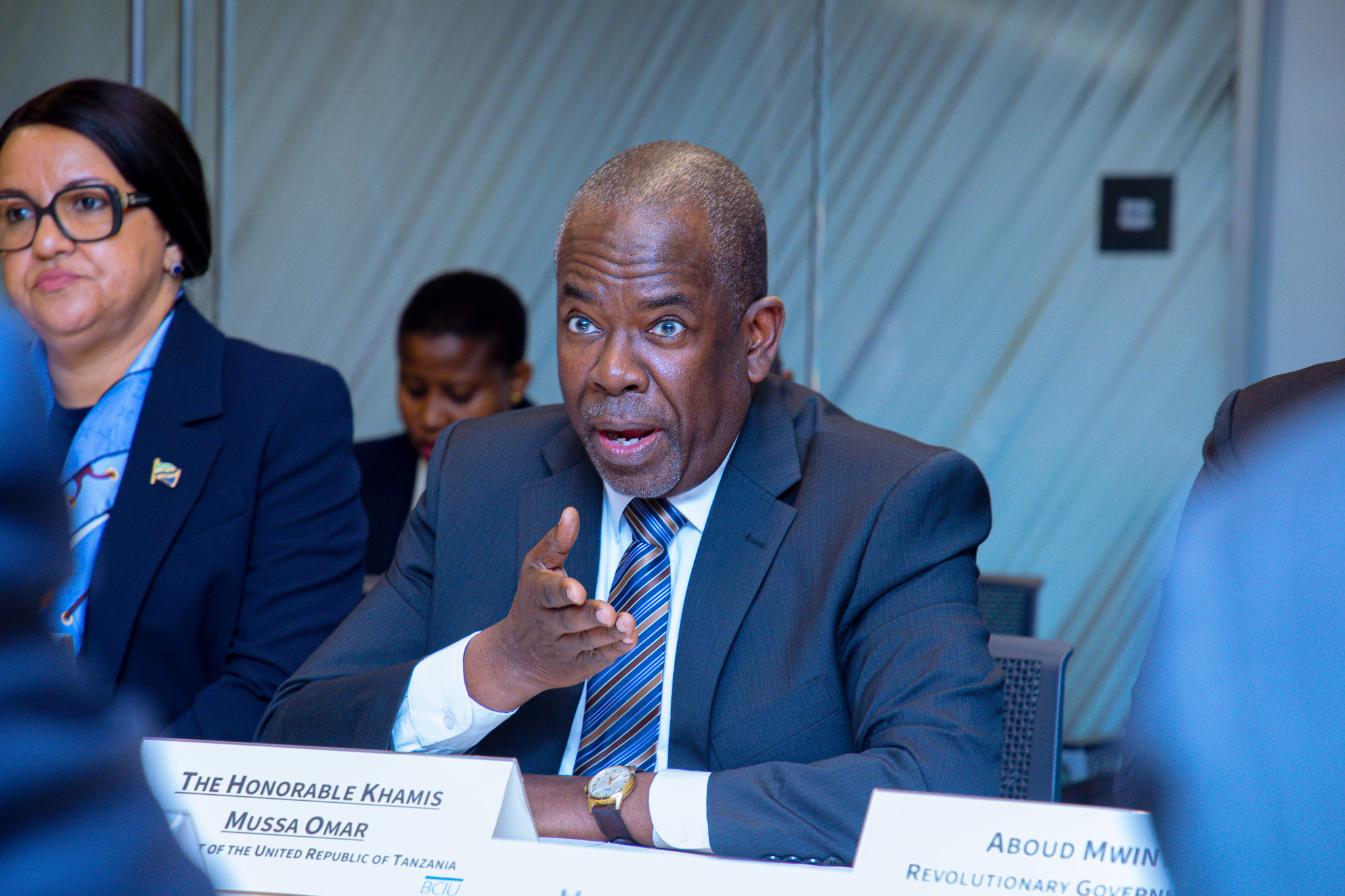 Waziri wa Fedha, Mhe. Balozi Khamis Mussa Omar (Mb), akizungumza jambo wakati wa MKutano wa Uwekezaji ulioandaliwa na Baraza la Biashara – Business Council for International Understanding (BCIU), uliofanyika katika Ofisi za BCIU, jijini Washington D.C nchini Marekani, pembezoni mwa Mikutano ya Majira ya Kipupwe ya Benki ya Dunia na Shirika la Fedha la Kimataifa-IMF, ambapo BCIU wameonesha nia kuwekeza nchini katika Bima kwa wakulima, kuzalisha mbegu bora za kisasa, bandari na katika Sekta ya Afya.