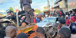 Wananchi wakiangalia gari dogo aina ya Altezza lililopoteza mwelekeo na kusababisha vifo vya watu wawili eneo la eneo la karibu na stendi ya mabasi mjini Moshi.